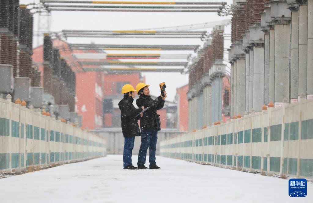 1月19日,在河南省南阳市蓝天燃气有限公司,工人冒雪在燃气供应站进行安全巡检。