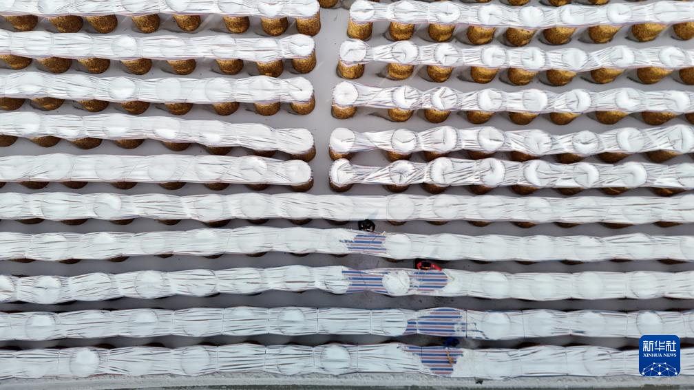 1月19日,山东省滨州市滨城区杨柳雪镇的农民在清理玉米囤苫盖上的积雪(无人机照片)。