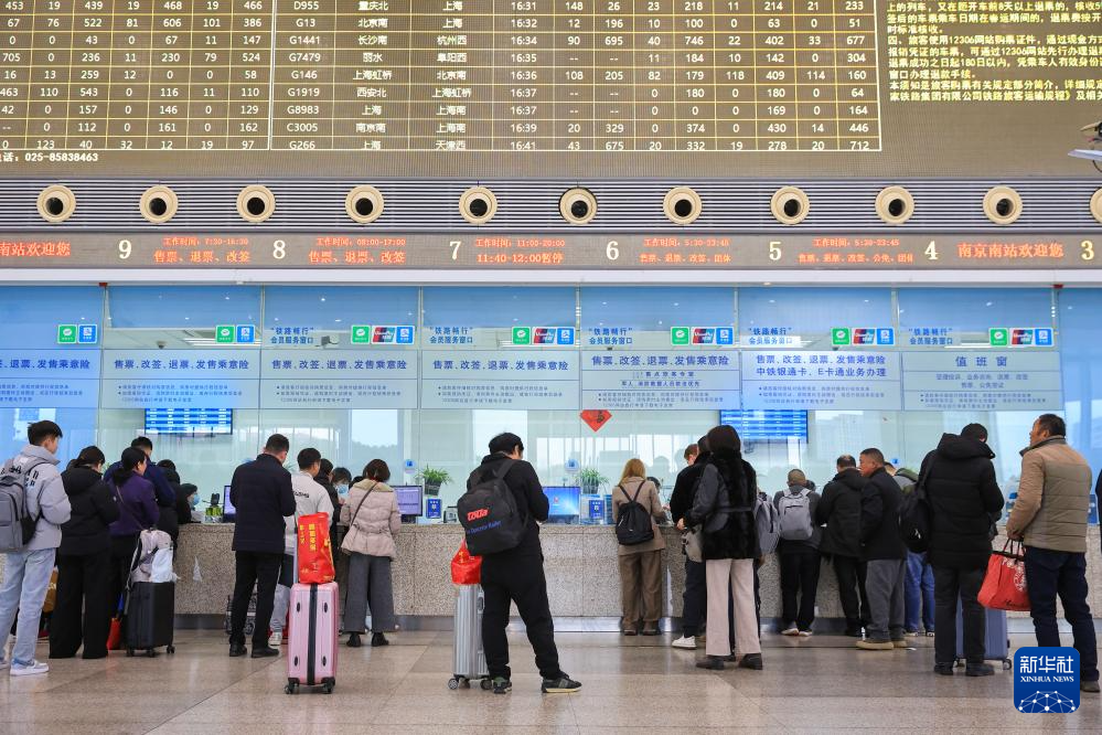 1月19日,南京南站工作人员在售票处为旅客办理车票业务。
