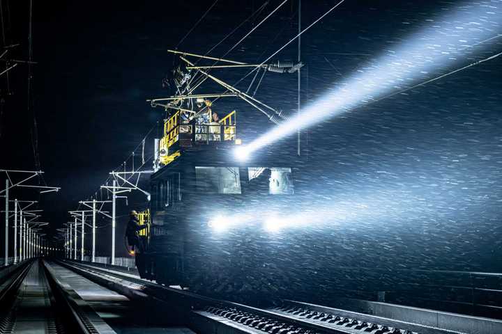 1月20日凌晨,沪渝蓉沿江高铁武宜段钟祥南至荆门西线路上,一辆机车在开展接触网设备检修作业。(受访单位供图)