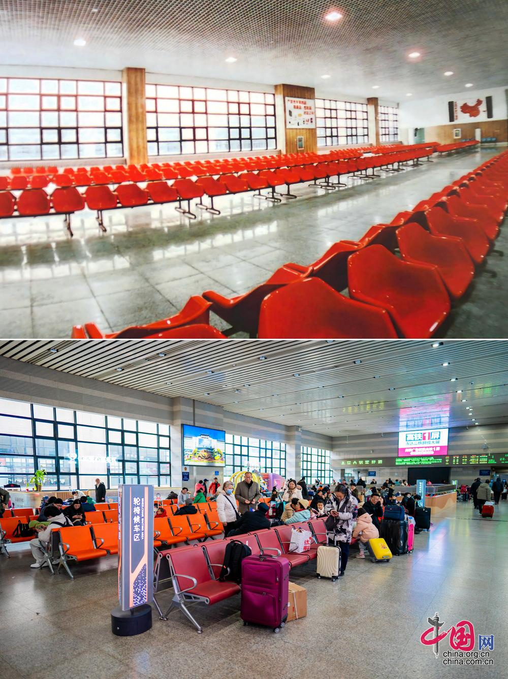北京西站候车室内座椅变迁。如今的北京西站优化整合“四区一室”功能分区,设置儿童娱乐区(家长陪护区)、敬老候车区、轮椅候车区、便捷换乘区四个功能服务区,满足重点旅客个性化需求。(上图为历史照片,下图为中国网记者 郑亮2026年拍摄)