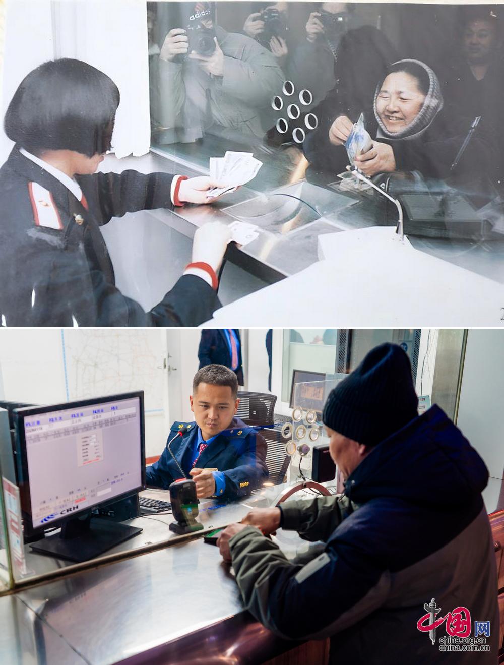 北京西站售票处变化。1996年5月,北京西站作为全国较早使用计算机售票的火车站率先迈进了新时代。30年后的今天,售票处完成从老式主机到智能终端的变化,这些设备功能更强、操作更快。(上图为历史照片,下图为中国网记者 郑亮2026年拍摄)