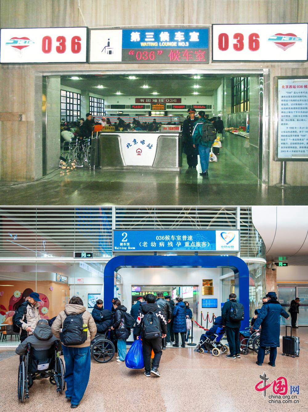 北京西站“036”候车室。为发扬客运服务员李淑珍的服务精神,1999年7月15日,北京西站成立“036”爱心候车室专为重点旅客提供服务。自此,“036”由一个工牌号成为一个服务群体,20多年服务实践铸就了“诚心待客、热心服务、真心助人、实心爱岗”的“036”四心精神,成为全行业文明服务的典范。(上图为历史照片,下图为中国网记者 郑亮2026年拍摄)