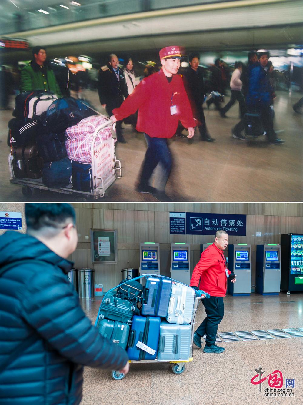 北京西站内小红帽服务一如既往地热情周到。(上图为历史照片,下图为中国网记者 郑亮2026年拍摄)