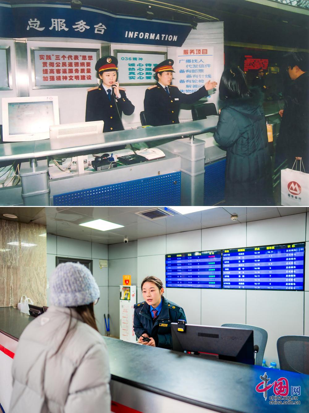 北京西站总服务台到12306服务台的变迁。(上图为历史照片,下图为中国网记者 郑亮2026年拍摄)