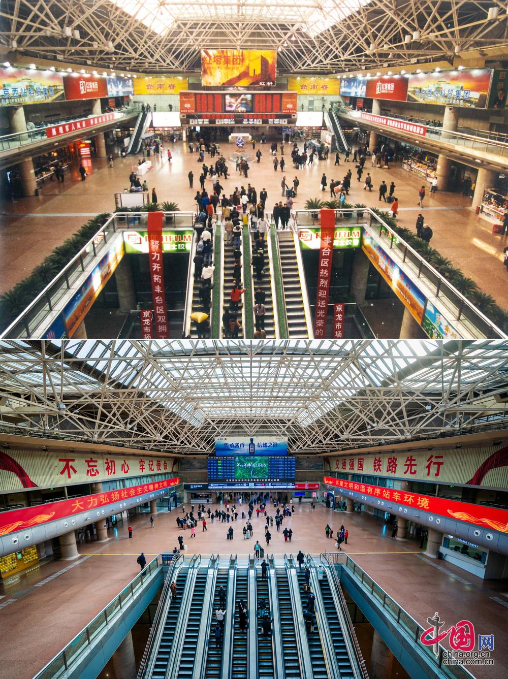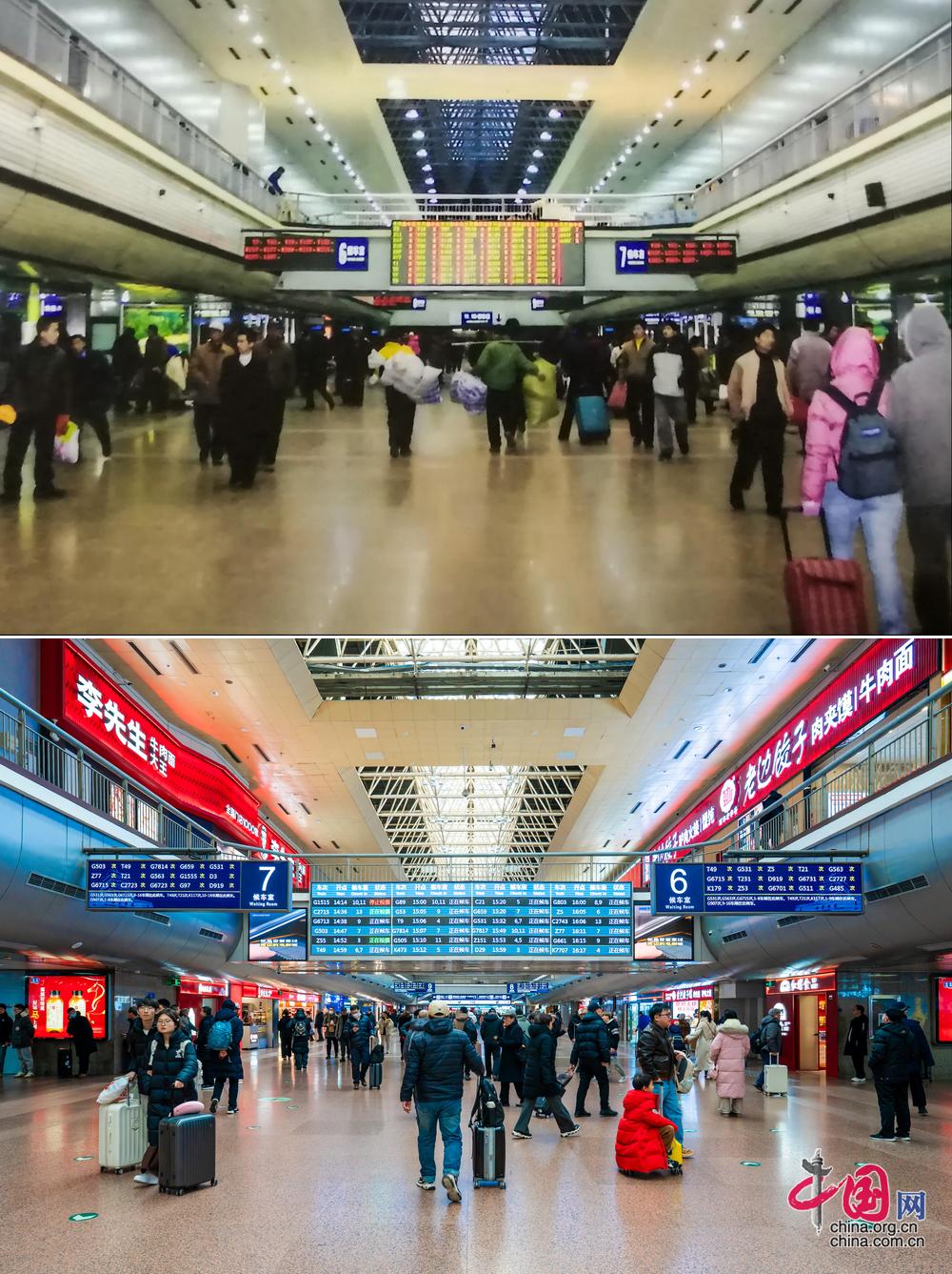 北京西站北二楼大厅变化对比。(上图为历史照片,下图为中国网记者 郑亮2026年拍摄)