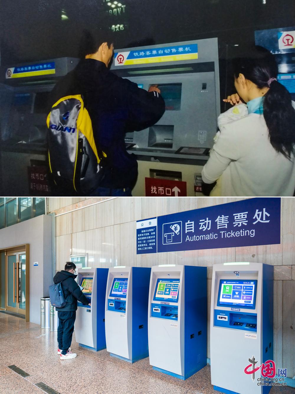 北京西站内的自动售票机。北京西站第一台铁路自动售票机于2002年12月28日正式投入使用,此后自动售票机不断迭代大大缓解窗口压力。(上图为历史照片,下图为中国网记者 郑亮2026年拍摄)