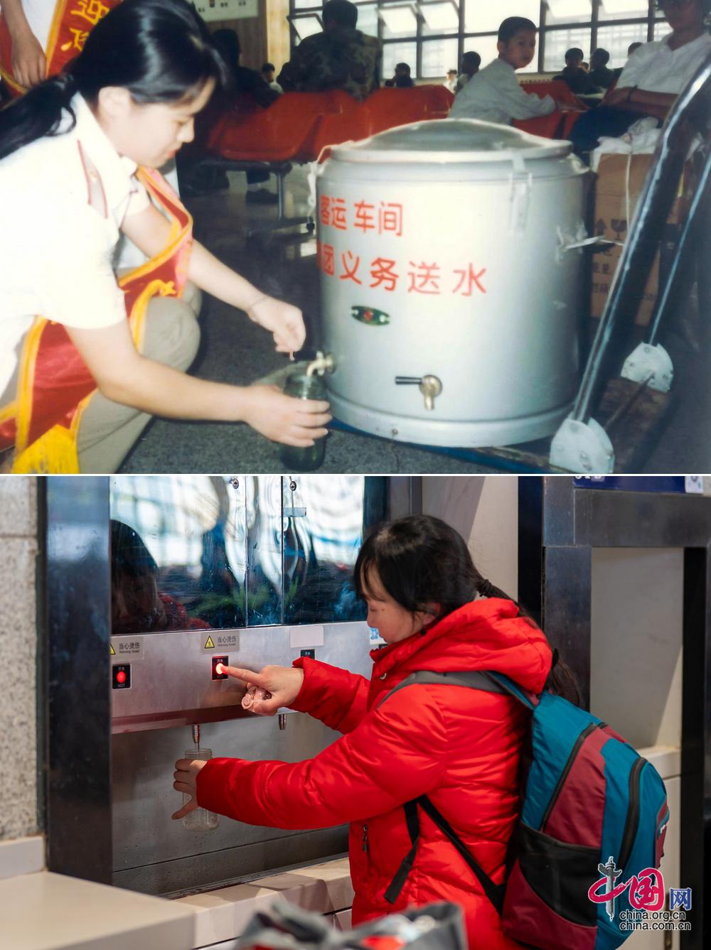 北京西站站内的饮水服务。从当年的移动式义务送水车到如今的直饮水、温度智能调控、新风系统、免费充电区等便民设施一应俱全,这些微小的变化背后是持续优化旅客体验的结果。冬暖夏凉、饮水无忧,不再只是环境设施的改善,更是一种服务能力的呈现。(上图为历史照片,下图为中国网记者 郑亮2026年拍摄)