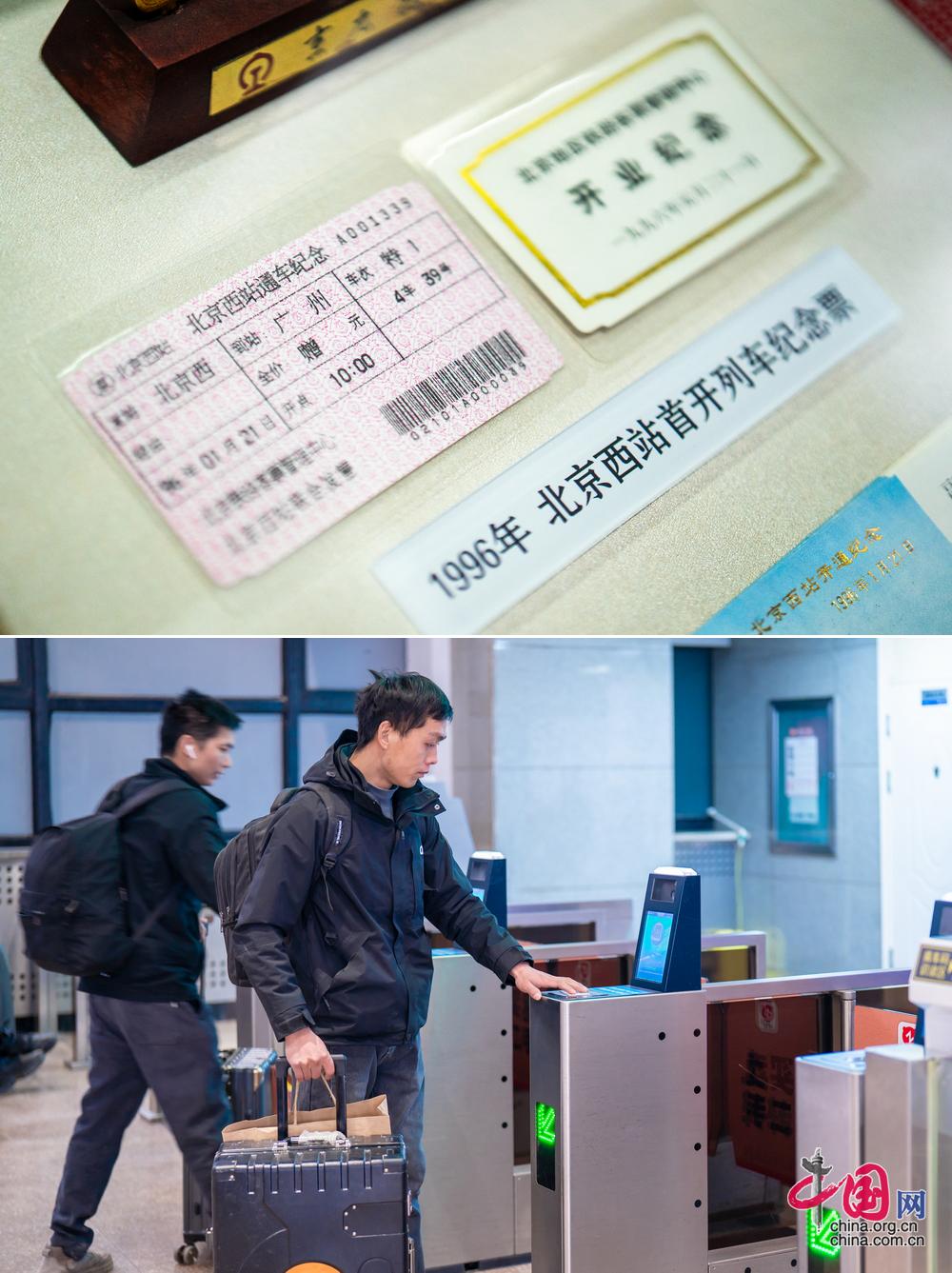 北京西站进站口闸机变化。从1996年1月21日北京西站开站人工售票窗口售出的第一张车票到现在旅客使用手机即可完成下单,凭身份证无须取票即可进站上车,这一系列变化极大地优化了旅客乘车体验。(上图为历史照片,下图为中国网记者 郑亮2026年拍摄)