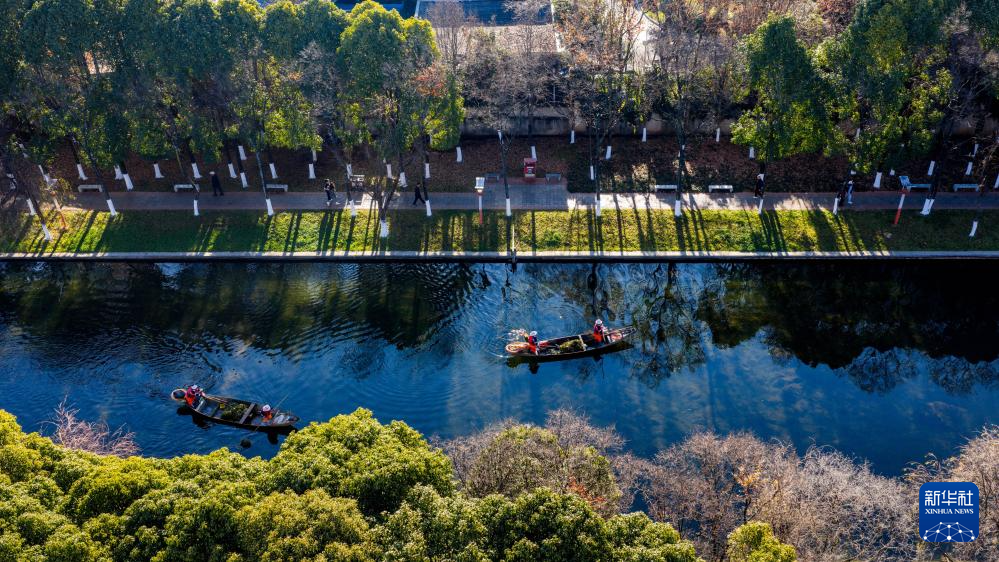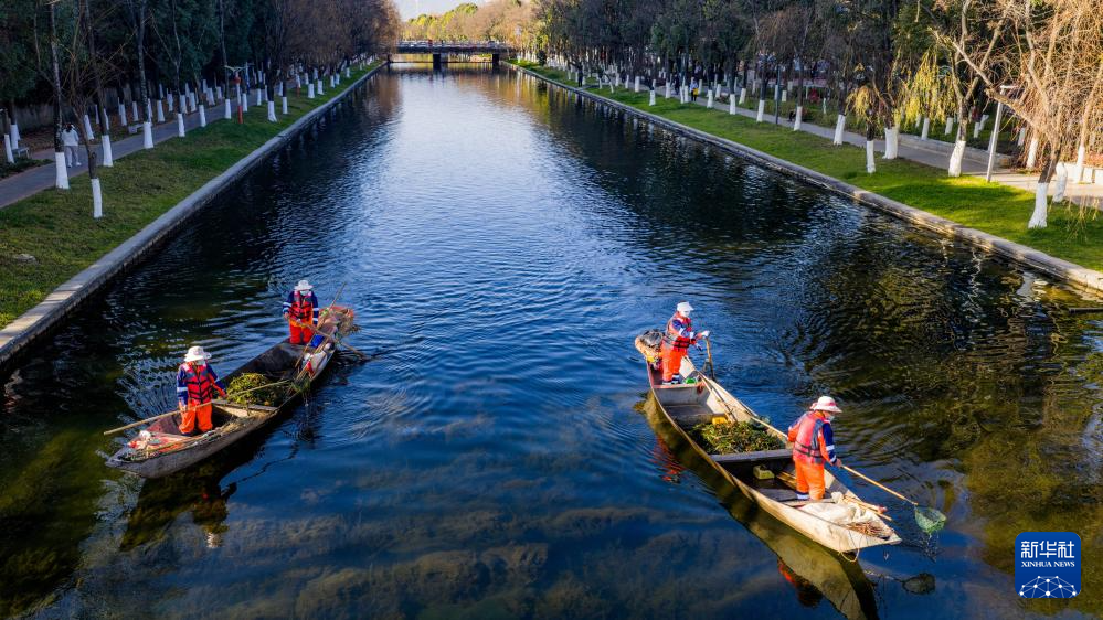 1月22日,工作人员在滇池入湖河道船房河进行打捞作业(无人机照片)。