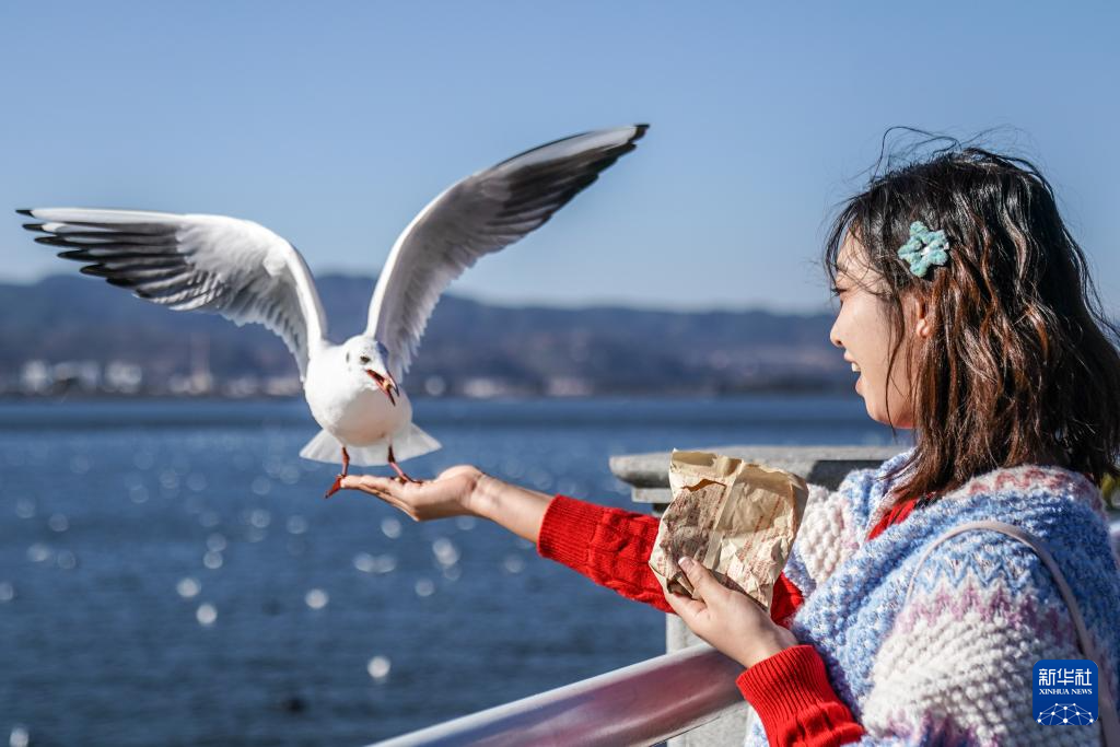 1月22日,游客在滇池畔喂红嘴鸥。