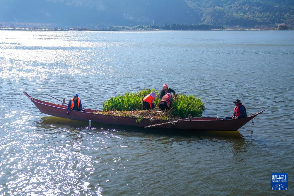 1月22日,工作人员对滇池里的生态浮岛进行植物管护。