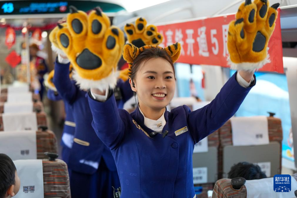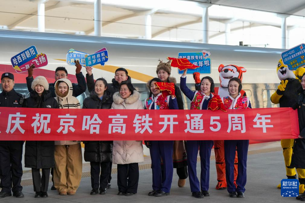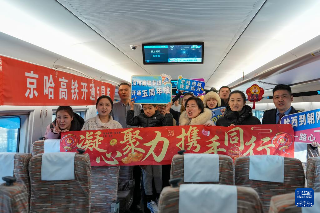 1月22日,全长1198公里的京哈高铁迎来全线开通运营五周年。在哈尔滨西开往北京朝阳的G902次动车组列车上,中国铁路哈尔滨局集团有限公司开展相关文旅互动活动。京哈高铁全线开通运营五年以来,中国铁路哈尔滨局集团有限公司累计运送京哈间旅客3936万人次。