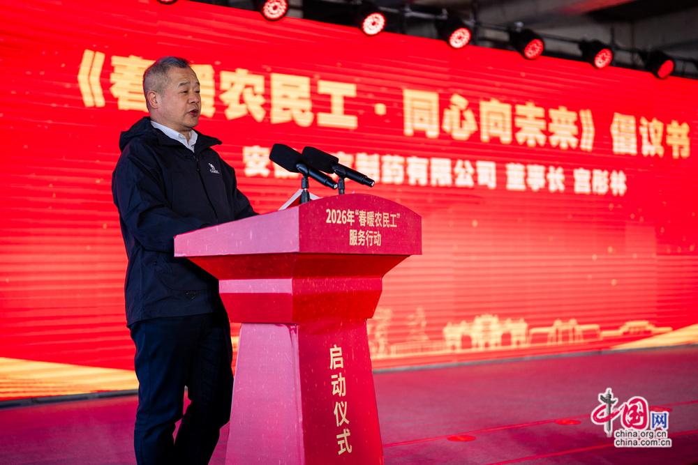 安徽九方制药有限公司董事长宫彤林宣读《春暖农民工•同心向未来》倡议书。中国网记者 郑亮摄
