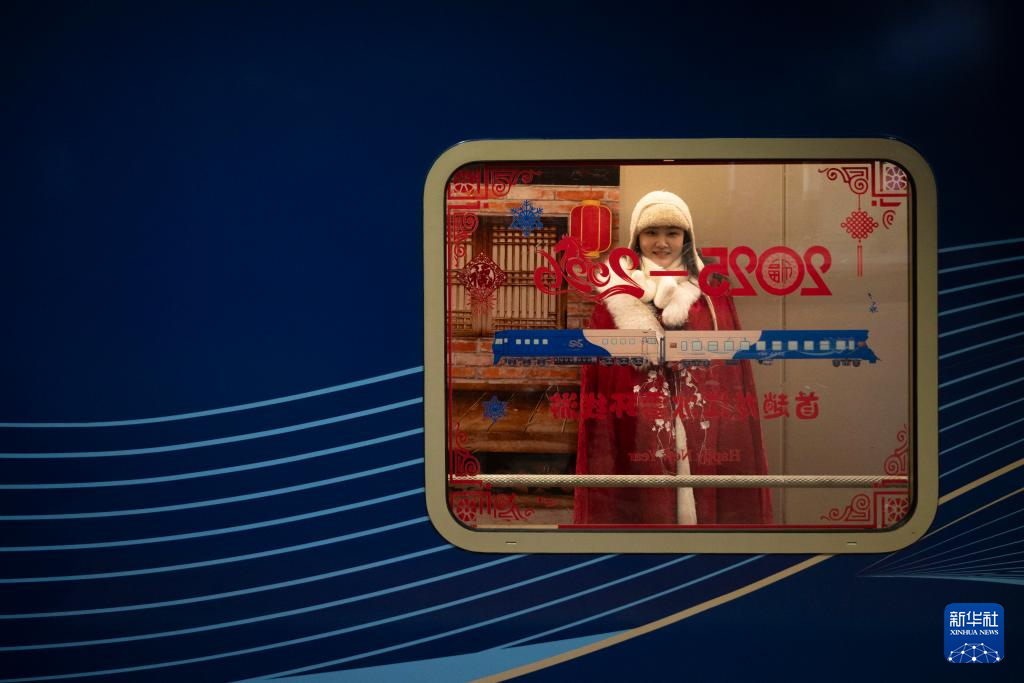 1月25日,工作人员在Y783次“悠享龙江·银旅号”列车上欢迎旅客乘车。