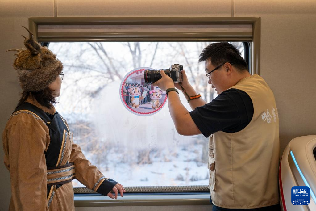 1月25日,摄影师在Y783次“悠享龙江·银旅号”列车上为旅客拍照。