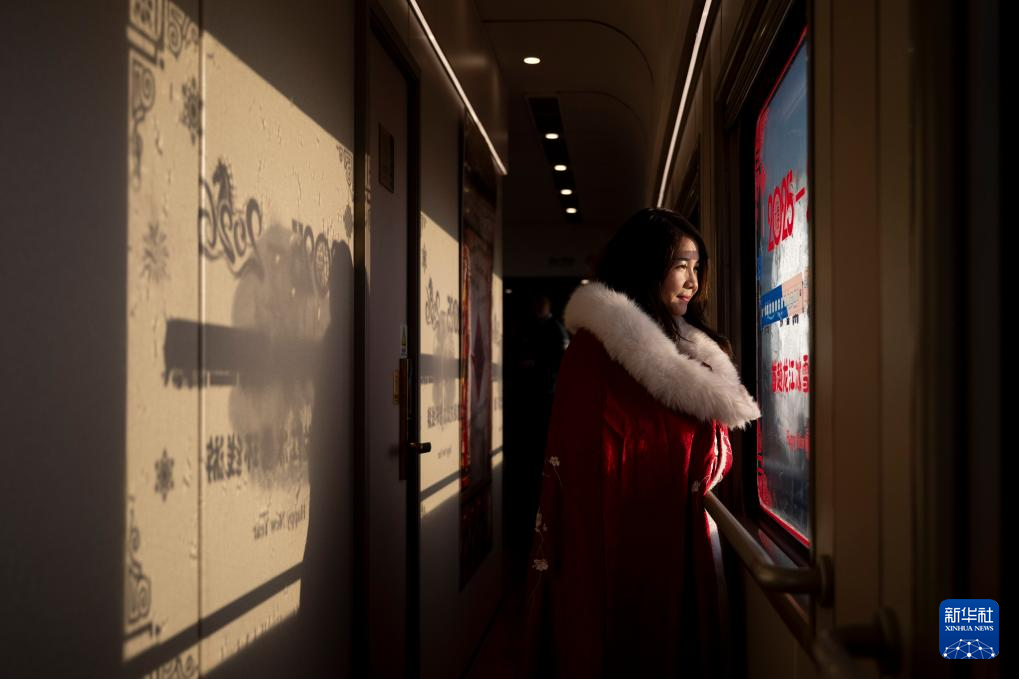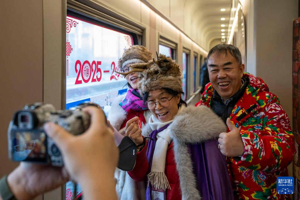 1月25日,旅客在Y783次“悠享龙江·银旅号”列车上拍照。