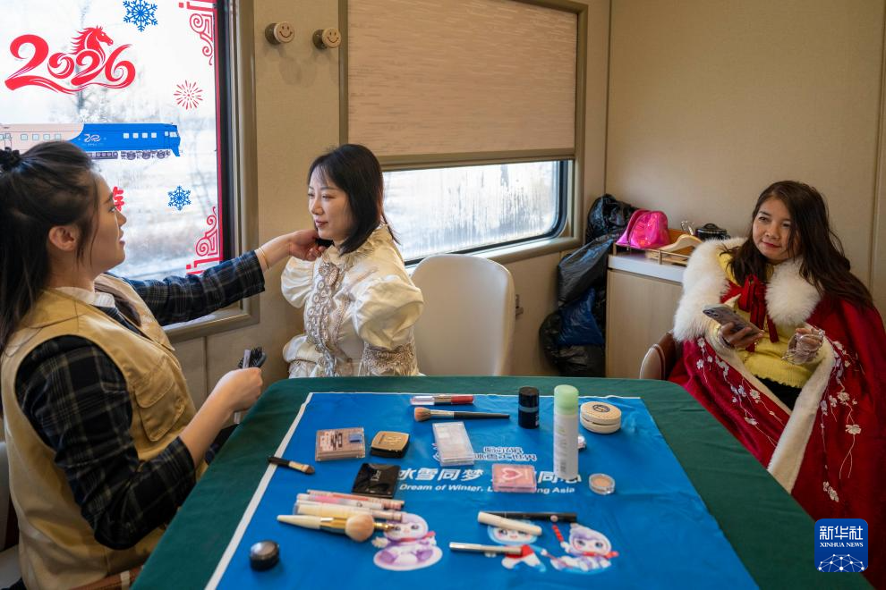 1月25日,旅客在Y783次“悠享龙江·银旅号”列车上化妆。