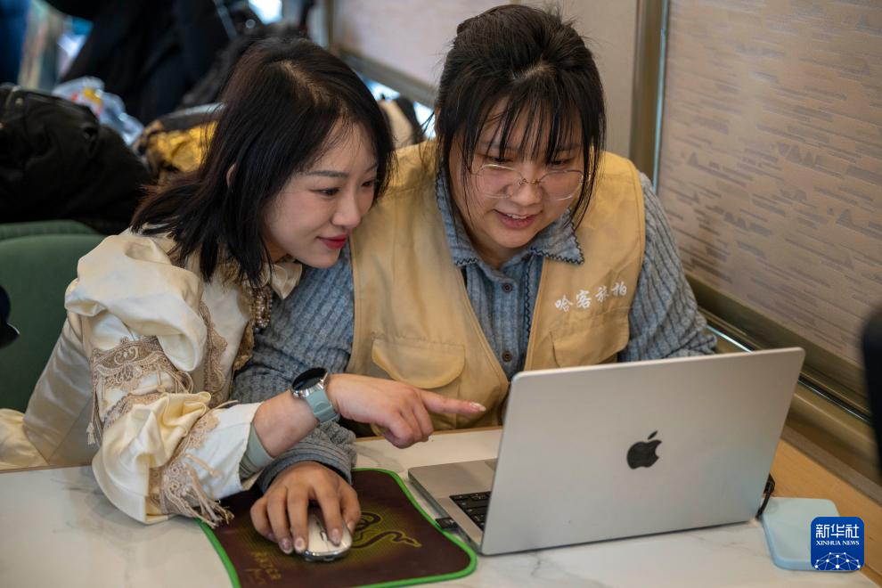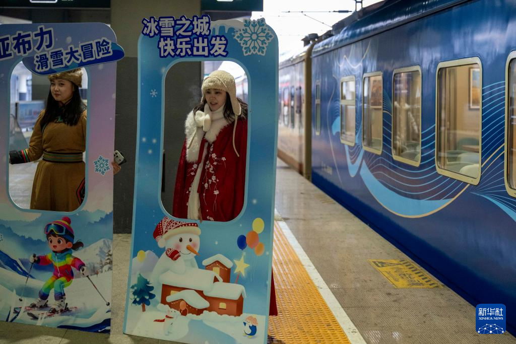 1月25日,在黑龙江省哈尔滨开往亚布力方向的Y783次“悠享龙江·银旅号”旅游列车上,旅客们换上各式服装,体验免费旅拍服务。这是中国铁路哈尔滨局集团有限公司今年开行的首趟旅拍列车,车体升级,空间更大,为旅客打造移动“照相馆”,提升旅客的旅拍体验。