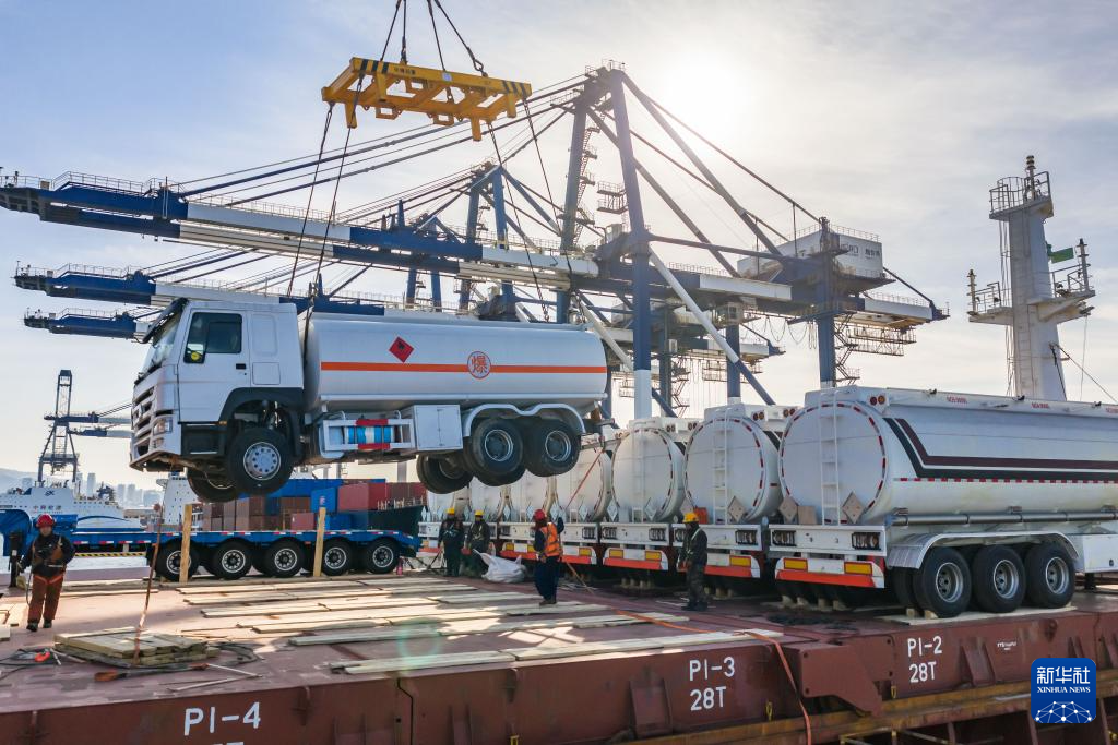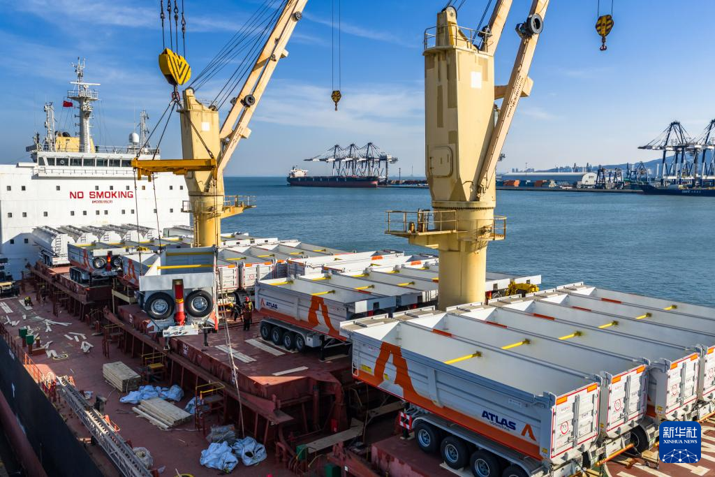 1月25日,在山东港口烟台港,工作人员将出口塞内加尔的卡车装入货轮(无人机照片)。