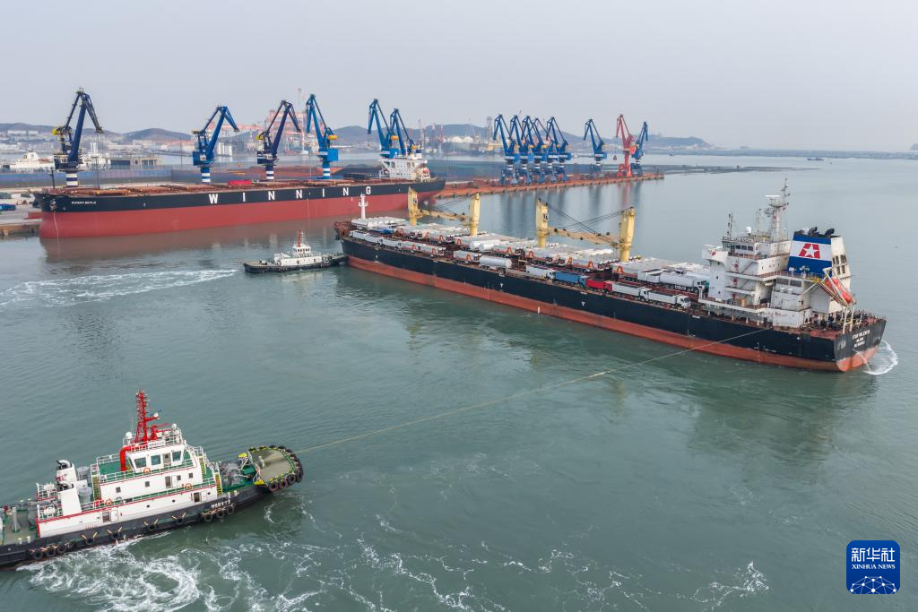 1月26日,“烟台港-塞内加尔达喀尔港”航线首班货轮从山东港口烟台港起航(无人机照片)。
