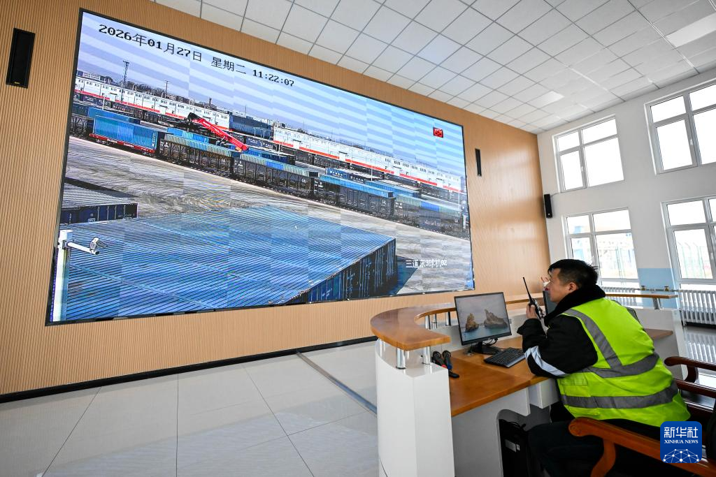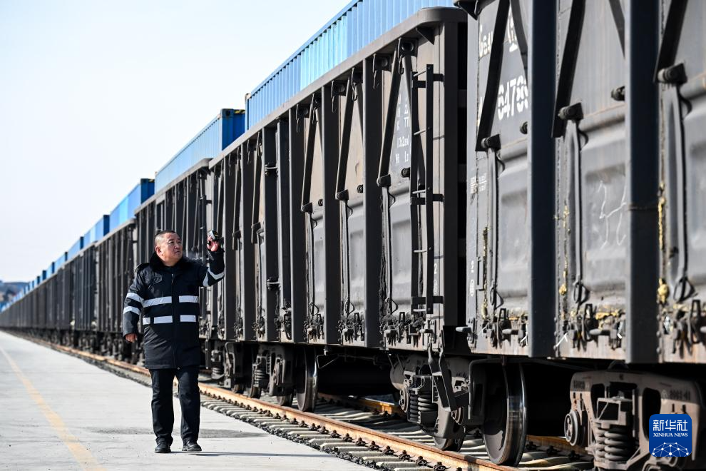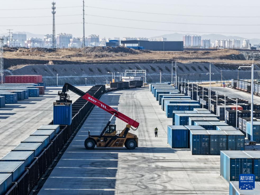 1月27日,工作人员在乌兰察布中欧班列集散中心查看中欧班列装车情况。