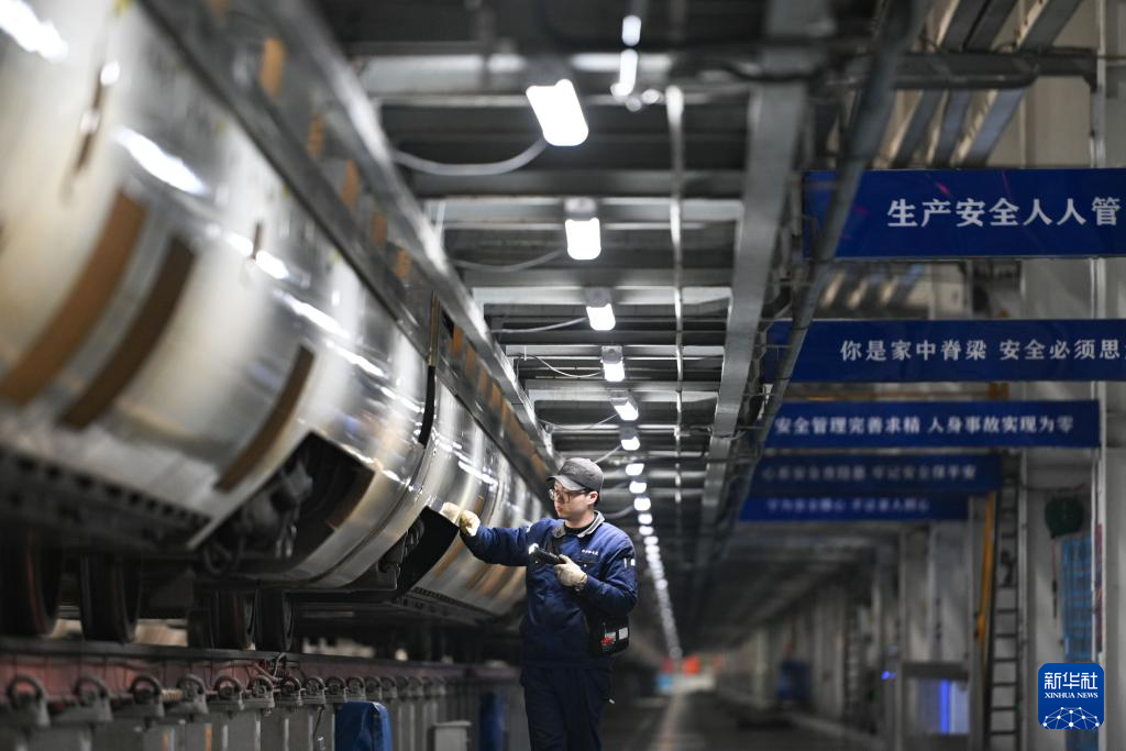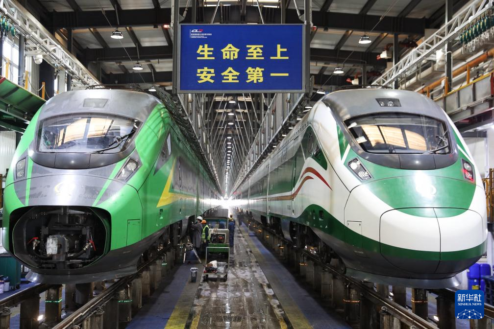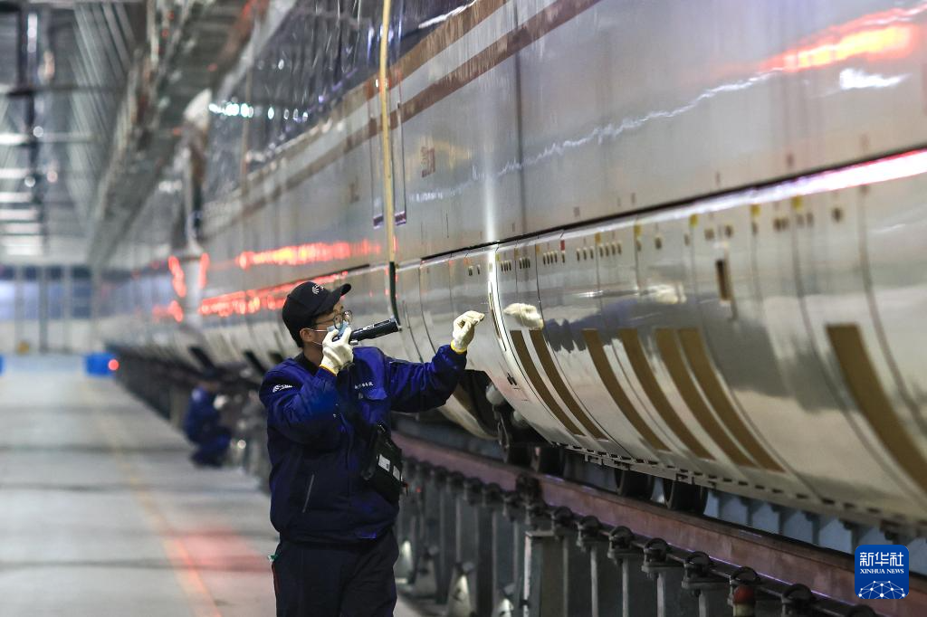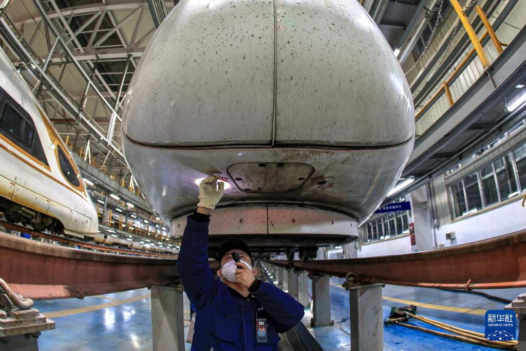 1月27日晚,工作人员在南京南动车运用所检修动车组列车。