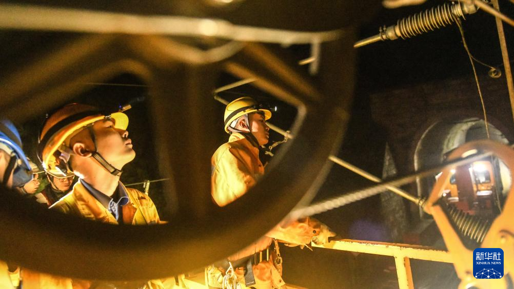1月29日,中国铁路南宁局集团有限公司接触网工在检查接触网腕臂装置与补偿滑轮的状态。