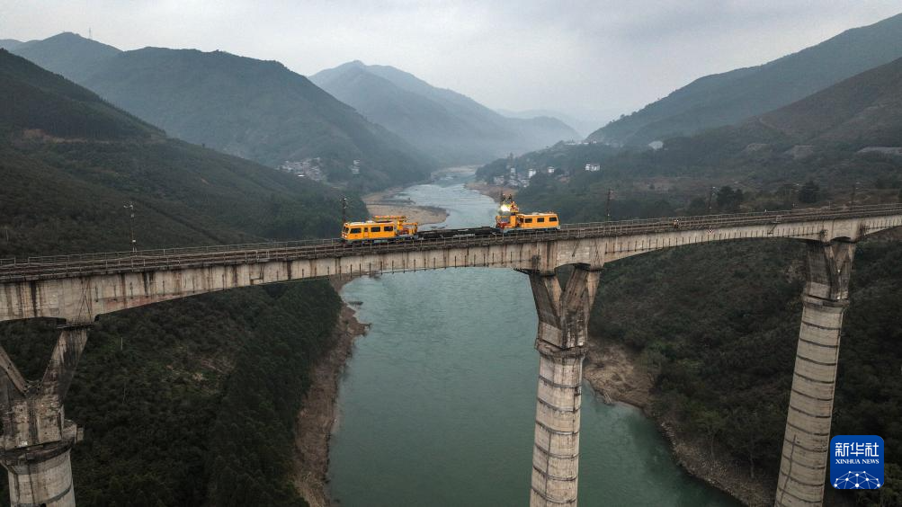 1月29日,中国铁路南宁局集团有限公司南宁供电段的接触网工在南盘江铁路大桥上检修接触网设备。