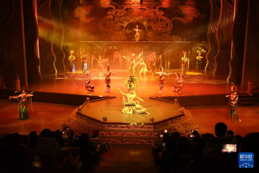 1月9日晚,游客观看大型洞窟沉浸式体验剧《乐动敦煌》。
