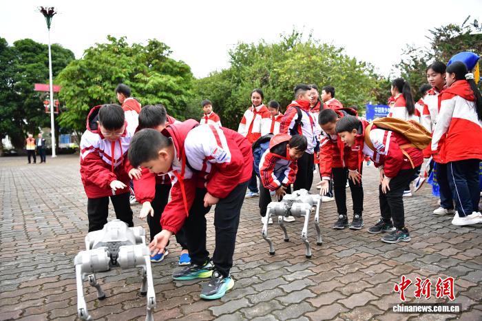在凭祥市高级中学,广西科技馆科普大篷车带来的机器人对抗表演、无人机救援演示等活动,吸引师生驻足围观。在现场,两国青少年共同体验背篓绣球项目;在科学实验器材、水火箭发射等多个展区,神奇的科学实验让大家惊呼不已;机器人、机器狗也随现场气氛舞动起来,引得大家笑声不断,纷纷与其握手合照......
