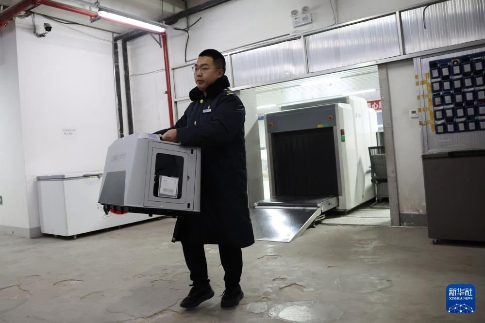 2月1日,中铁快运兰州西站营业部工作人员孙谦将旅客托运的宠物放在安检仪上准备进行安检。