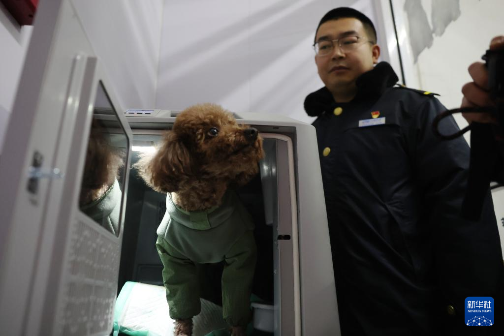 2月1日,在中铁快运兰州西站营业部宠物交接区,一只小狗进入高铁宠物运输专用箱等待托运。