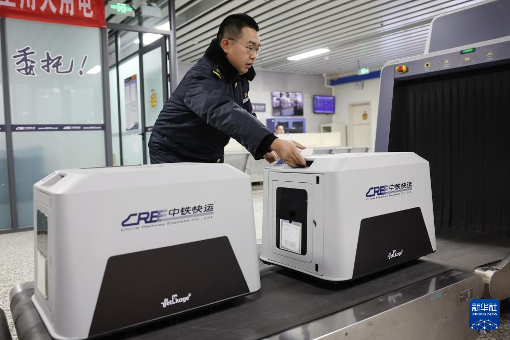 2月1日,中铁快运兰州西站营业部工作人员孙谦在检查高铁宠物运输专用箱。