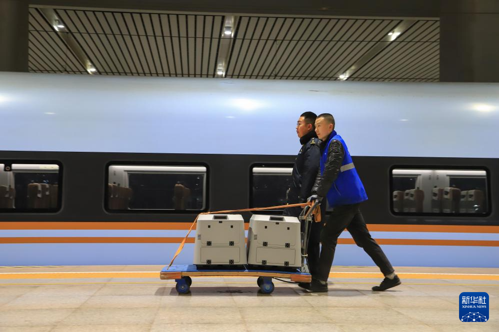 2月1日,在兰州西站站台上,中铁快运兰州西站营业部工作人员孙谦(左)和同事将旅客托运的宠物送上高铁列车。