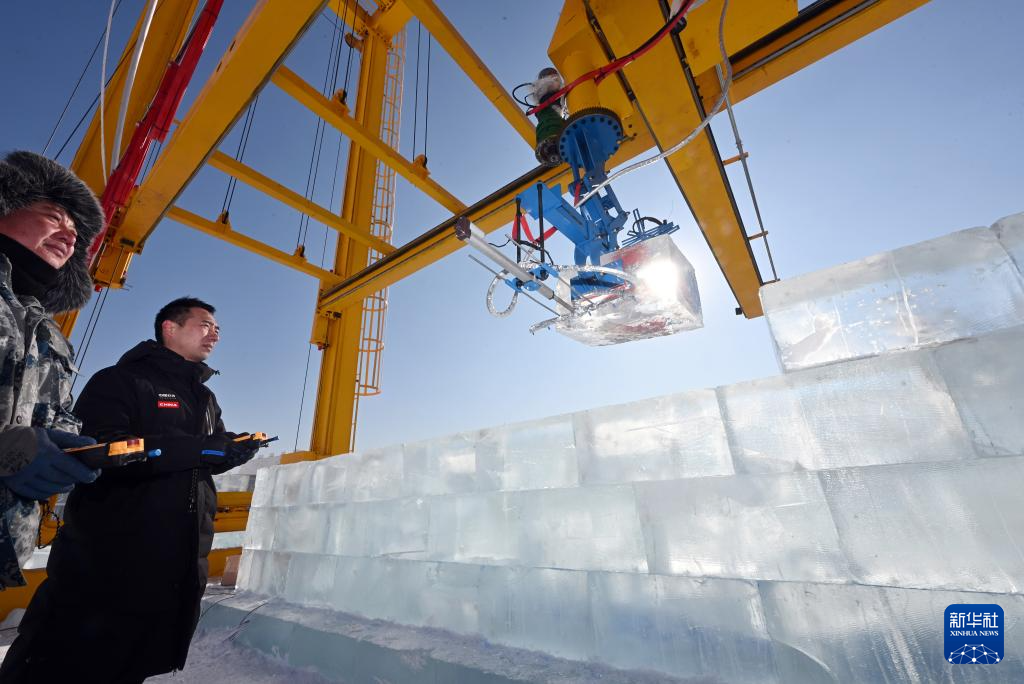 2月3日,在第二十七届哈尔滨冰雪大世界园区,智能大型冰雕自动化搭建机器人进行冰块的提升、搬运与砌筑。