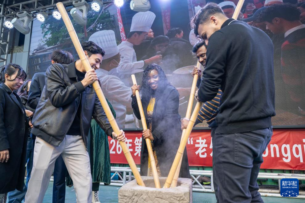 2月3日,在重庆市巴南区,留学生现场体验打糍粑。