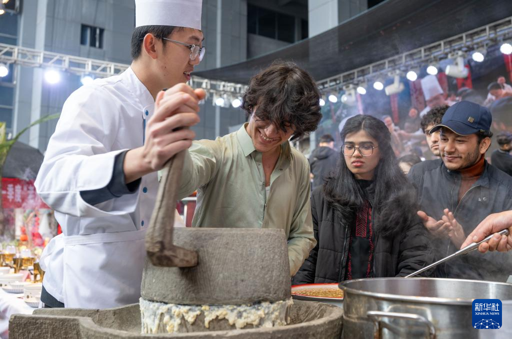 2月3日,在重庆市巴南区,留学生现场体验磨豆浆。