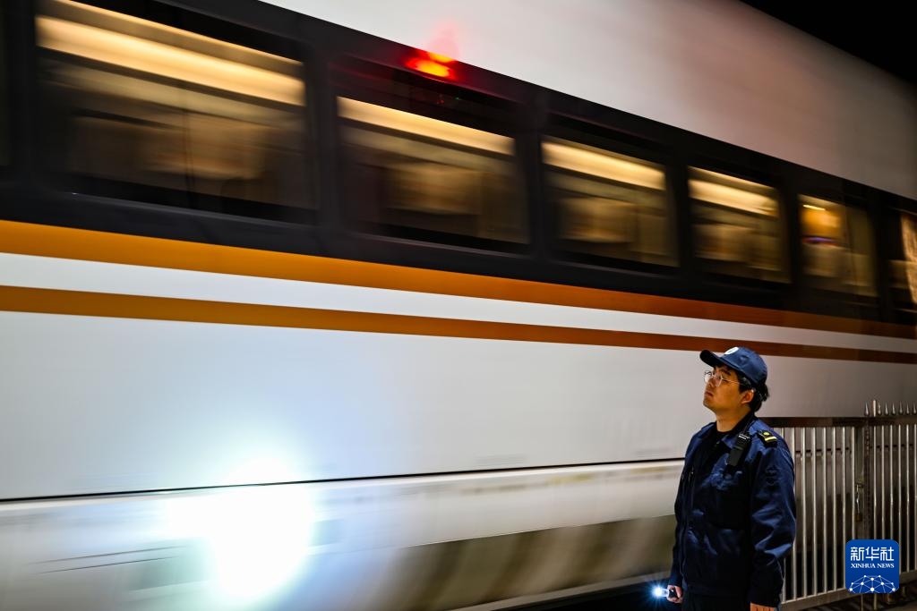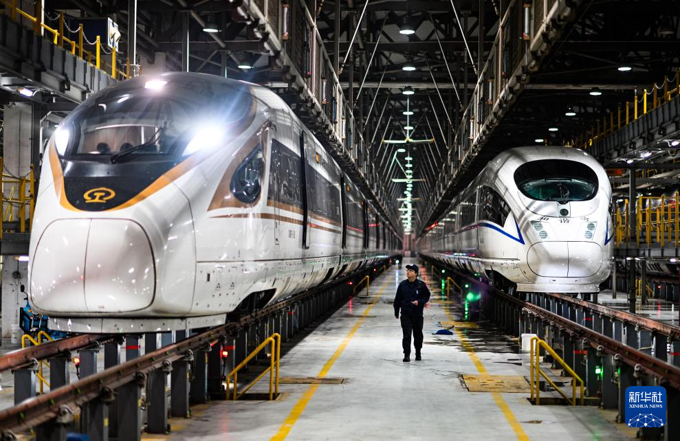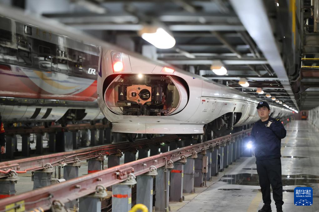 深夜的天津动车运用所检修库内,灯火通明,数列动车组整齐停靠在检修线上,等待“体检”。为确保春运列车安全准时出库,一级检修丁组工长李奇伟带领40余名同事彻夜奋战——从23时到次日8时,他们需完成28组动车的检修任务,工作量比平日增加了约20%。