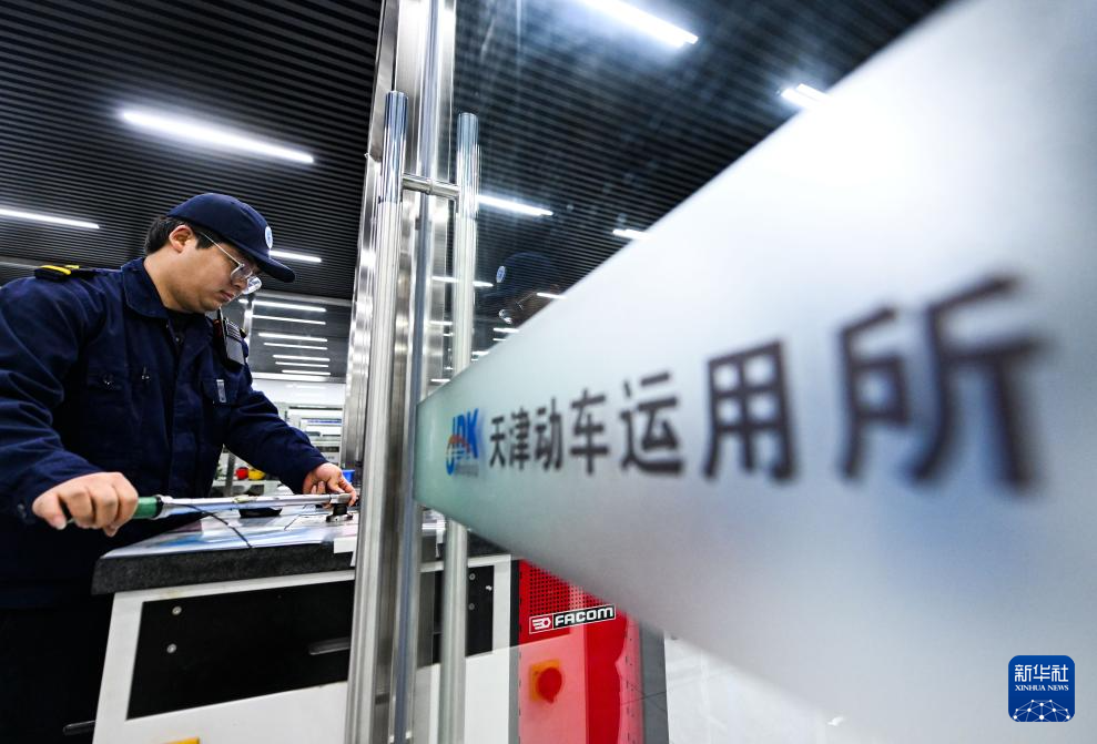 2月1日,在天津动车运用所检修库内,李奇伟和同事进行检修作业。