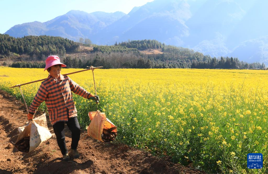 2月4日,农民在云南省腾冲市明光镇凤凰村凤凰山挑运刚采挖的山药。
