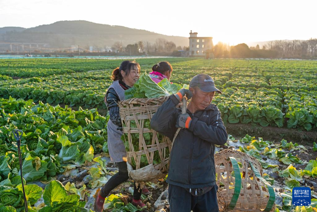 2月4日,农民在云南省曲靖市沾益区西平街道一处农田里收获大白菜。