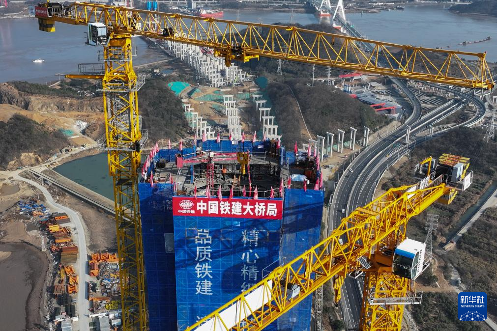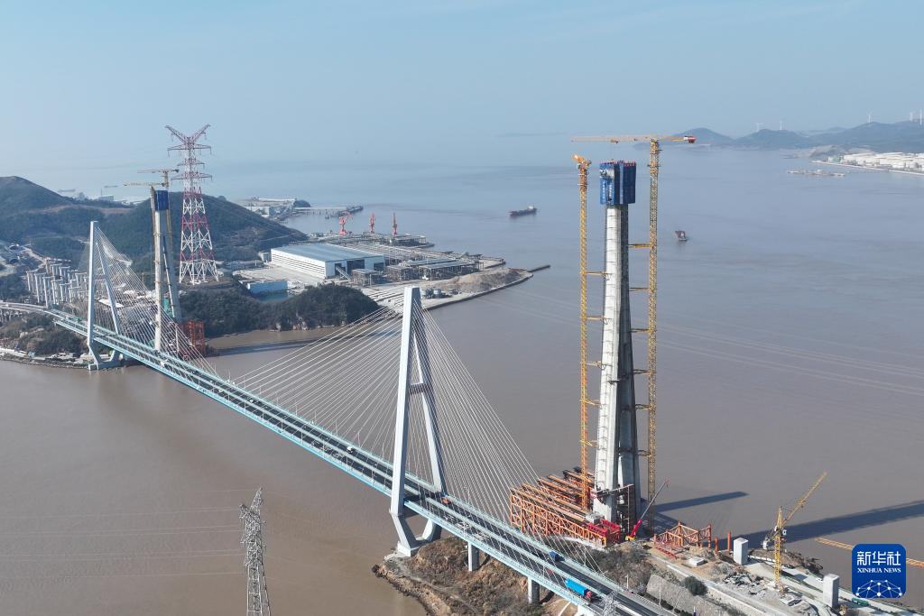 2月4日拍摄的甬舟铁路桃夭门公铁两用大桥6号主塔(右侧),承台以上高度达198.1米(无人机照片)。临近主塔的是桃夭门大桥,也是舟山跨海大桥的重要组成部分。