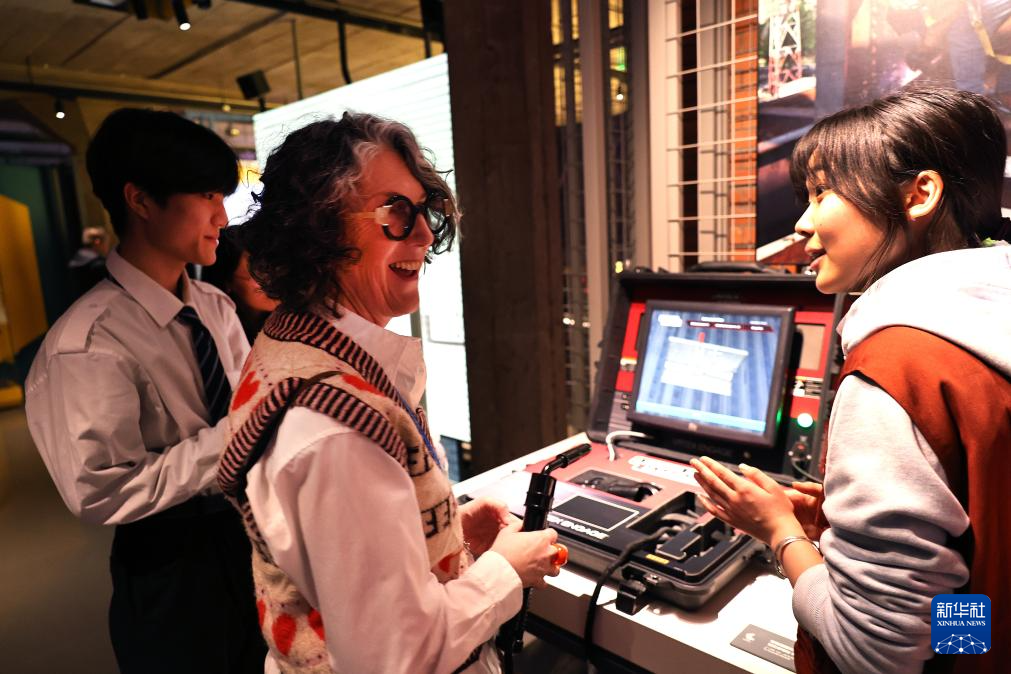 2月4日,嘉宾(中)在世界技能博物馆内体验模拟电焊互动游戏。