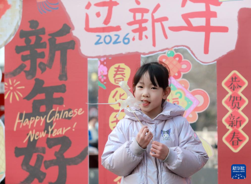 2月4日,在江苏省扬州市锦旺社区“非遗迎新春”市集活动中,一名小朋友在品尝糖人。