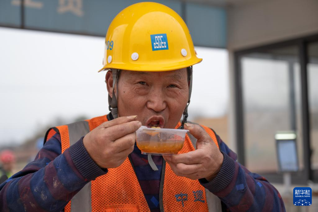 2月5日,在重庆市江津区重庆枢纽港先进机电装备和物流产业园项目建设现场,工人在吃汤圆。