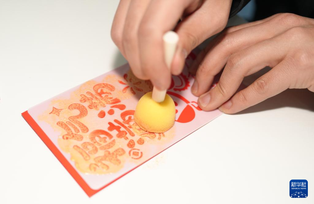2月5日,在中建二局安装公司雄安国贸中心项目举行的“建证未来 青聚雄安”主题活动上,一线建设者在制作手工拓印作品。