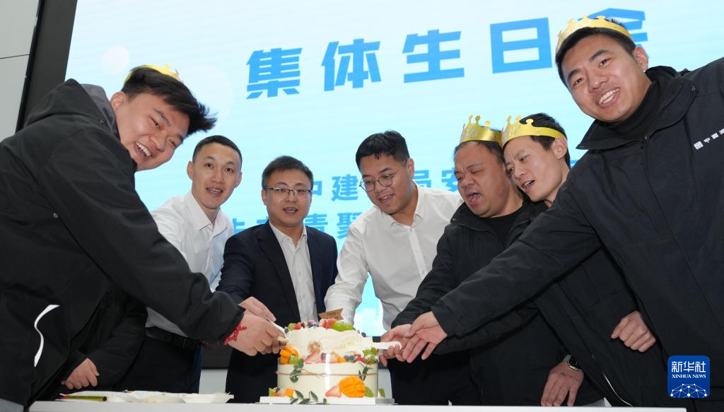 2月5日,在中建二局安装公司雄安国贸中心项目举行的“建证未来 青聚雄安”主题活动上,一线建设者在集体生日会上切蛋糕。