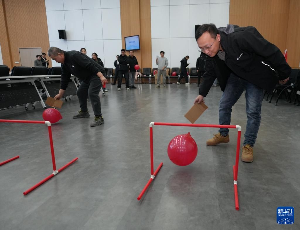 2月5日,在中建二局安装公司雄安国贸中心项目举行的“建证未来 青聚雄安”主题活动上,一线建设者参加名为“双人顶气球”的趣味节目。