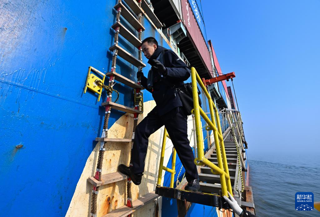 2月4日,在天津港锚地,天津港引航中心引航员孙勃攀爬软梯,他将在登船后引航该船入港。
